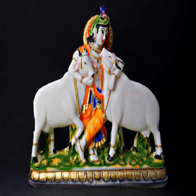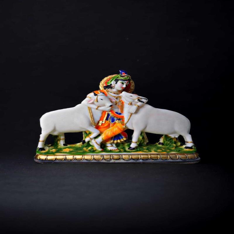 Bring home the divine charm of Lord Krishna with our beautifully crafted marble statue featuring Krishna with two cows. This exquisite piece captures the essence of Krishna's pastoral life, symbolizing love, compassion, and devotion. The fine craftsmanship and intricate detailing showcase the playful demeanor of Krishna, along with the grace of the cows, making it a perfect addition to your home altar or decorative space.